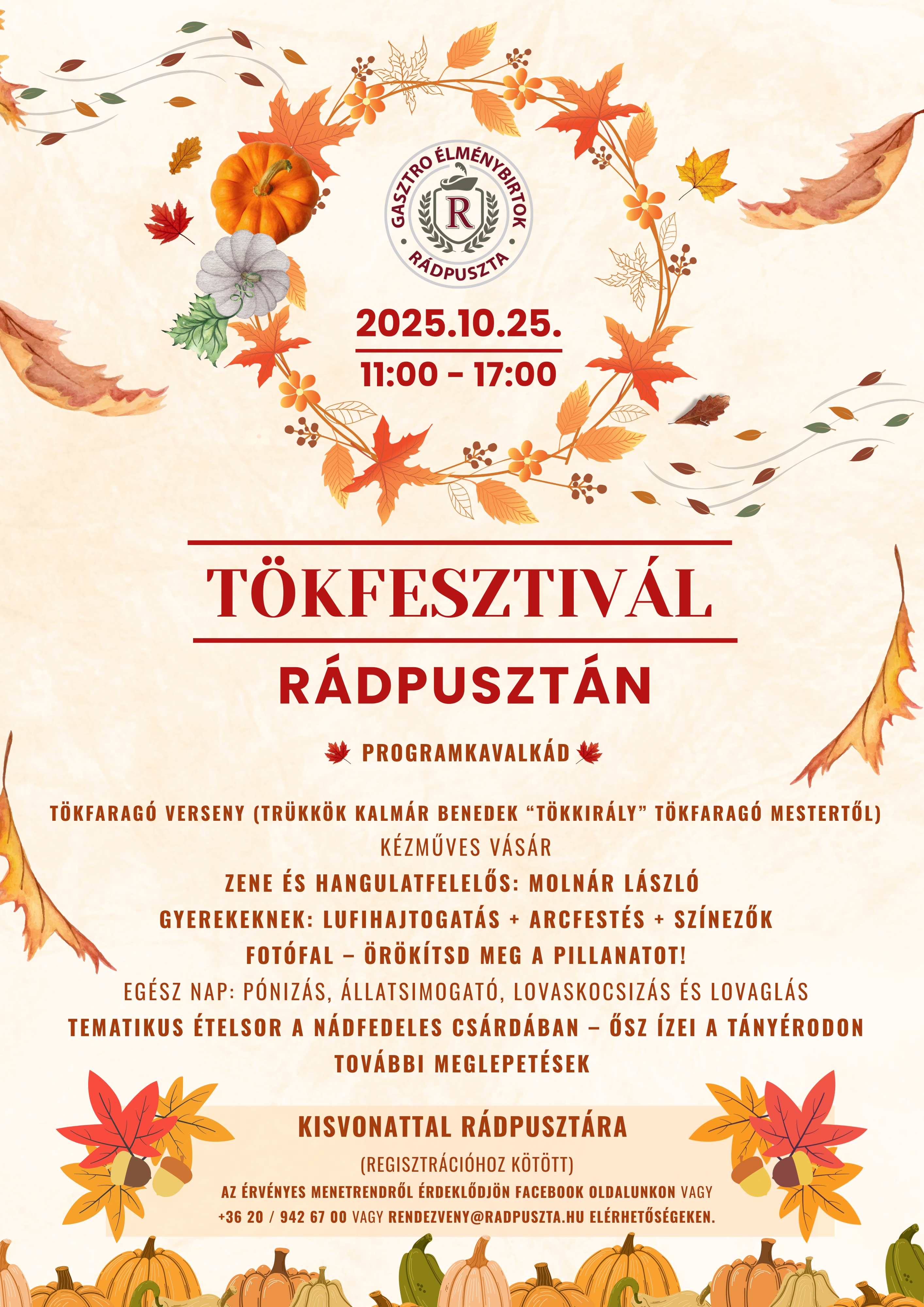 · AZ ÉRVÉNYES MENETRENDRŐL ÉRDEKLŐDJÖN A Rádpuszta-Gasztro Élménybirtok Facebook oldalán , telefonon a +36 20 / 942 67 00 számon vagy e-mailben a rendezveny@radpuszta.hu e-mail címen.